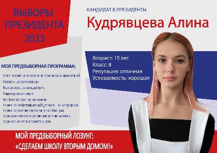 📌 Кандидат на пост Президента школы - Кудрявцева Алина, ученица 8 класса.